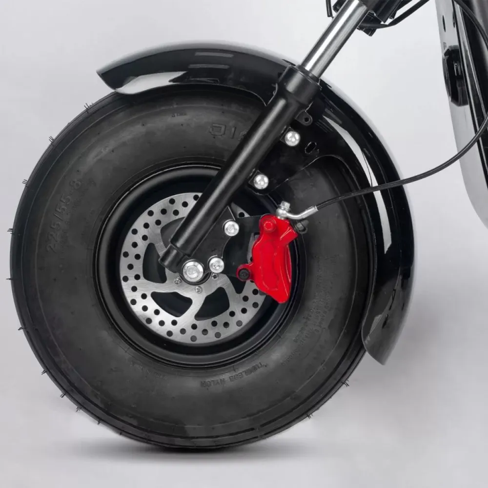 Электроскутер CityCoco Kugoo С3 PRO представляет собой современное транспортное средство, которое предназначено для поездок по городу, а также в условиях бездорожья. Благодаря широким 18-дюймовым колесам и системе амортизации, данная модель уверенно себя чувствует на пересеченной местности, компенсируя неровности дорожного покрытия. Мощный двигатель обеспечивает уверенный разгон до 50 км/час и позволяет легко преодолевать склоны и небольшие препятствия на пути. Электроскутером могут пользоваться сразу два человека. Удлиненное сиденье позволяет комфортно разместиться водителю и одному пассажиру. При этом прочная конструкция выдерживает нагрузку до 200 килограммов. Под сиденьем пассажира расположен закрытый багажный отсек, благодаря которому можно не беспокоиться о сохранности перевозимых вещей даже в неблагоприятных погодных условиях. Полного заряда батареи хватает на 50 километров пути. Если поездка затянется до позднего вечера - на помощь придет система освещения, которая включает в себя переднюю фару, габаритные огни и поворотники. Прочная металлическая подножка позволяет припарковать транспортное средство у любом удобном месте. Электроскутер Kugoo С3 PRO выполнен в классическом сдержанном стиле и придется по душе как мужчинам, так и женщинам.