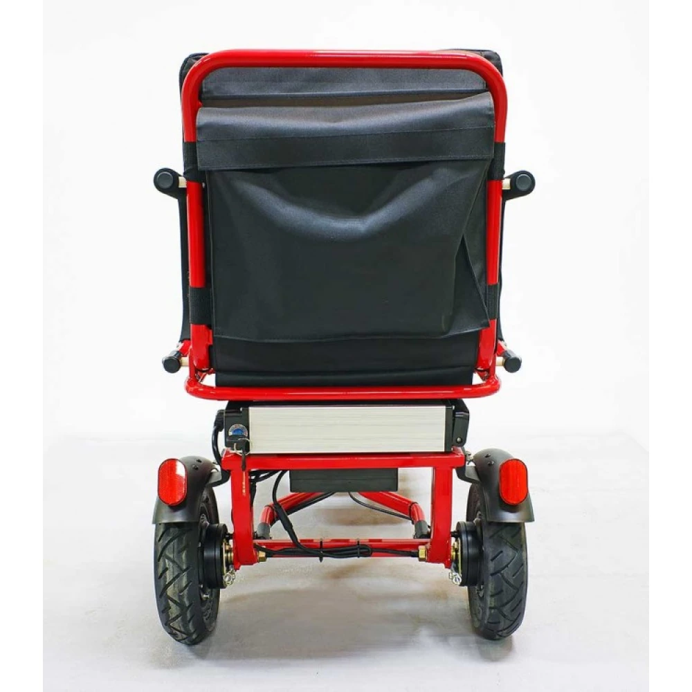 Широкая прорезиненная платформа обеспечивает полноценное размещение стоп, не вызывает усталости ездока. Светодиодная передняя фара допускает движение в вечернее время суток и непогоду. Электротрицикл – современная складная техника, которую сложить можно движением одной руки. В сложенном положении техника напоминает чемодан с ручкой.