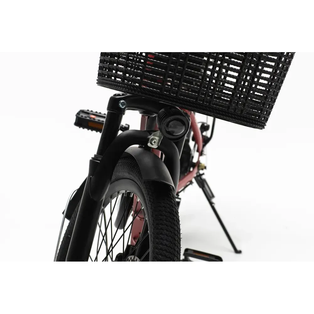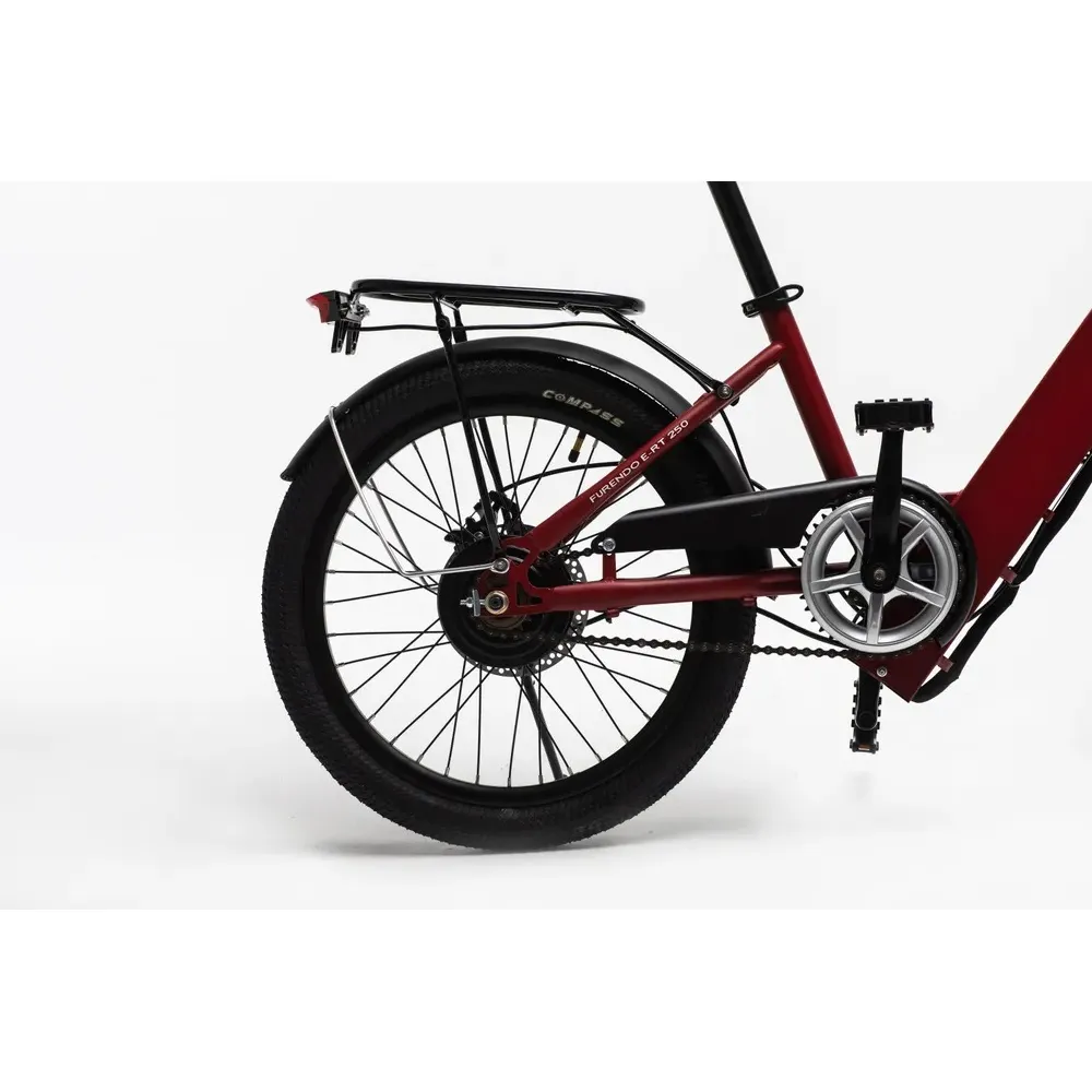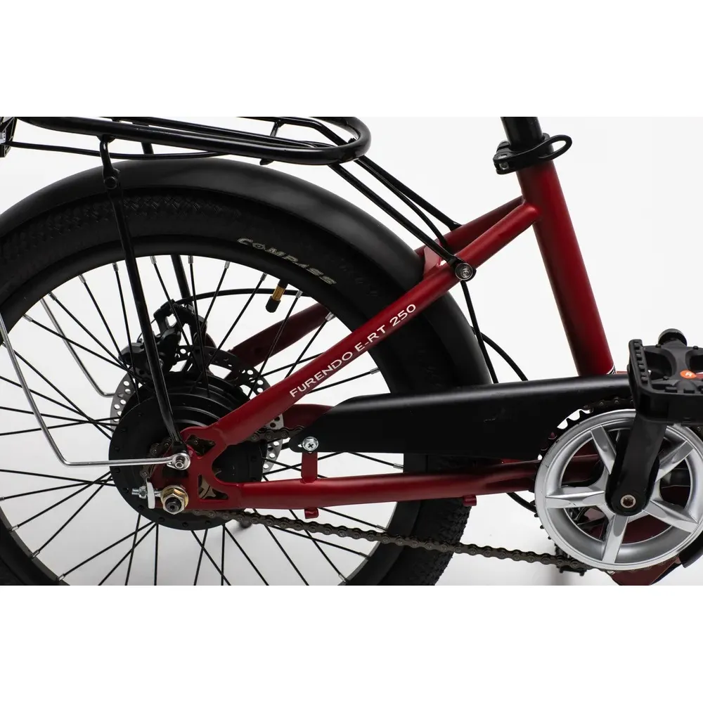 Электровелосипед FURENDO E-RT 250 поставляется в двух цветовых гаммах: рубиново-красный матовый и черный матовый. Это достаточно компактный электрический велосипед с высокой маневренностью, который отлично вписывается в городской траффик. Дисковые механические тормоза находятся спереди. Диаметр колес - 20 дюймов, а бескамерные шины подарят вам чувство комфорта при передвижении по неровной поверхности, а также они надежны и устойчивы к повреждениям.