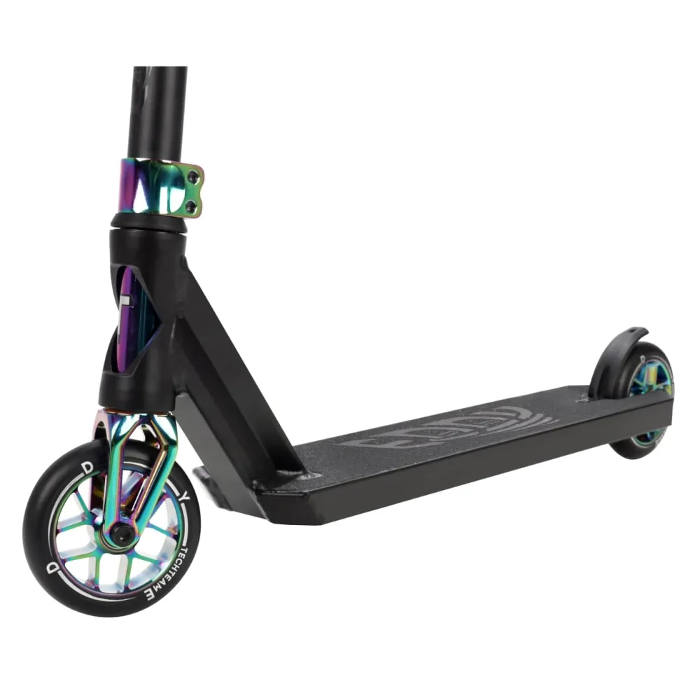 Колеса SHR – из высочайшего в своем классе полиуретана. С классическими колесами в 11 см (как переднее так и заднее). Эта модель представлена в цвете «нео-хром» или как её ещё очень часто называют «бензин». Сам по себе самокат выполнен в строгих цветах, но имеет крепеж рулевой и вилку выделяющую его и отличающую от черного собрата. Оба цвета представлены в нашем магазине. Дека имеет скос под рулевой и надежно сварена. Габариты деки 52 см общая длина, ширина 11 см. Вилка IHC с «двухболтовым» зажимным механизмом. Вес самокат не достигает и 4-х килограмм. Это действительно одна из самых прогрессивных моделей – за счет внедрения нового тормоза для облегчения и использования новых сплавов. При этом самокат и не растерял прочности и не подведет своего райдера во время исполнения элементов на площадке или в стрите.